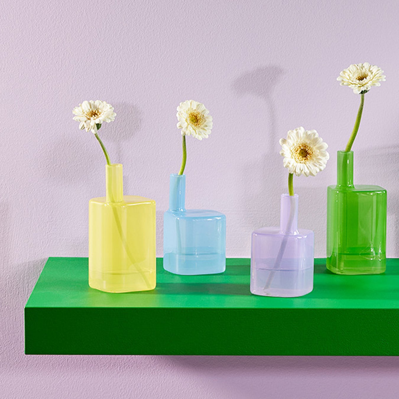 柔らかな色合いのガラスで作られた、タウンハウスのようなフォルムのフラワーベースです。煙突には小さな花などを飾ることができます。サイズと色を組み合わせて、おうちにカラフルな街の景色を作ってみましょう。