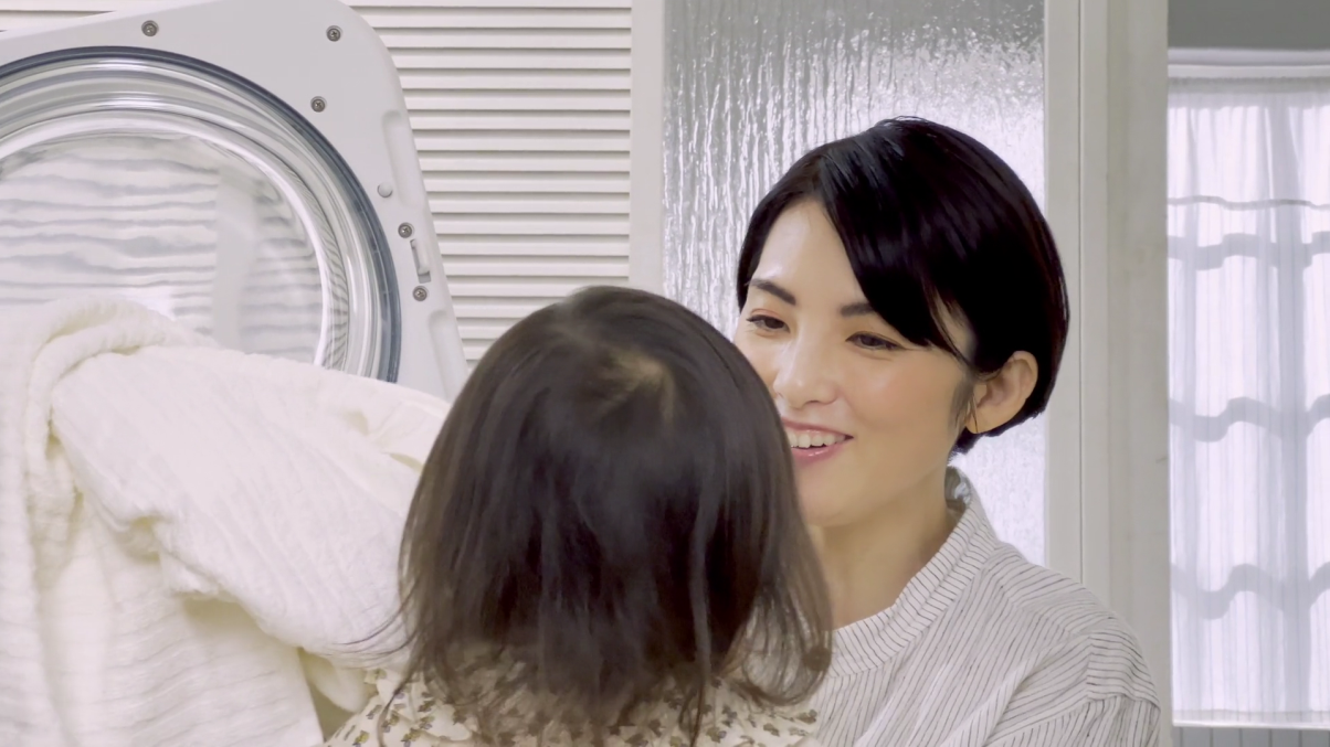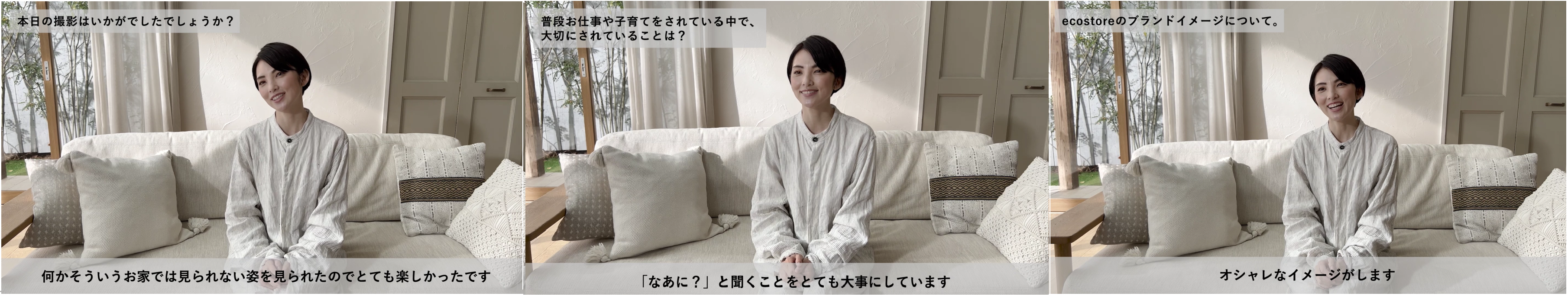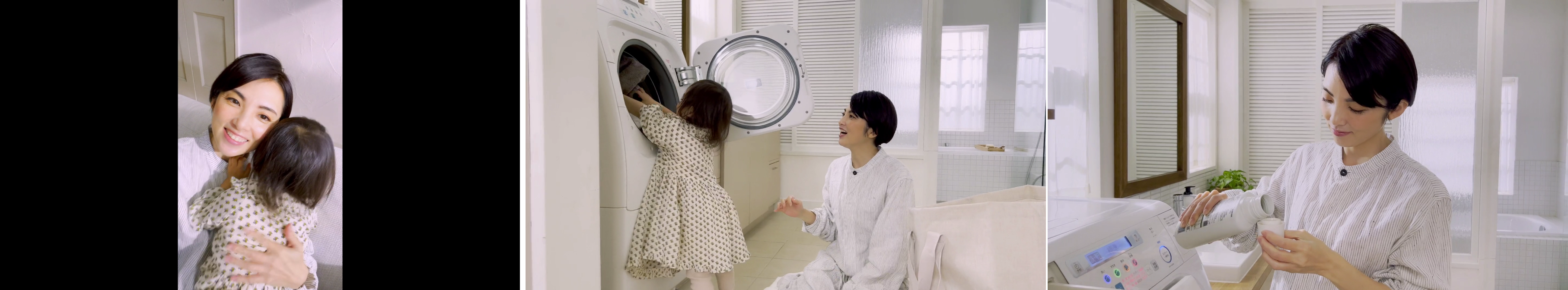 田中麗奈さんが親子で出演。エコストア愛用者でもある田中さんによる、ママ目線でのたいせつなものを表現するため起用しました。田中さんが家の中でお子さんと遊んだり、洗濯のお手伝いをするお子さんを見守る様子などを描いています。田中さんの笑顔も印象的です。