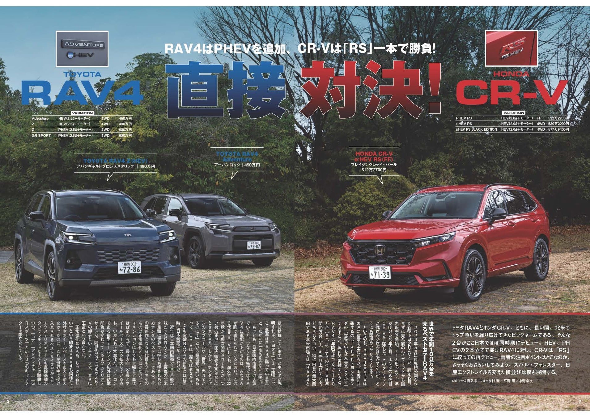 巻頭企画は、ミドルクラスを代表するトヨタRAV4とホンダCR-Vによる「直接対決」。ともに最新モデルとなった両メーカーのベストセラーそれぞれの見どころに迫ります。