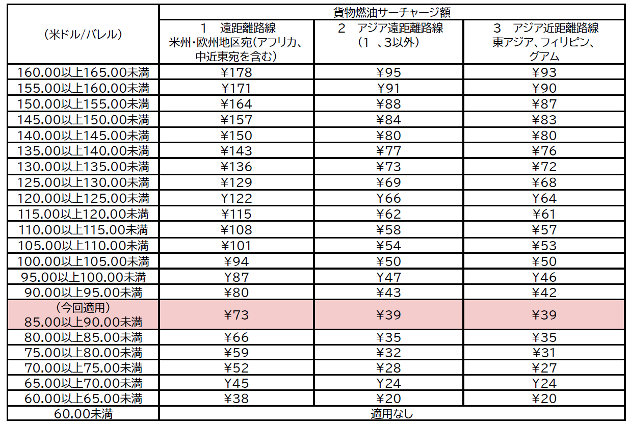 基準となる2025年2月のジェット燃料の平均価格が1バレルあたり88.91米ドルであったことから、燃油指標価格を「85.00以上90.00未満」とし、サーチャージ額は1kgあたり73円(米州・欧州など遠距離路線)、39円(アジア遠距離路線)、39円(アジア近距離路線)となります。