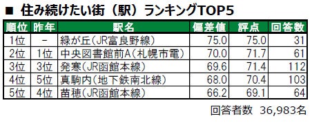 旭川市に位置する緑が丘が、初登場で1位に輝きました。緑が丘は、昨年は累計回答数が30名未満でランキング集計対象外でした。2位は中央図書館前A、3位は2年連続で札幌市西区に位置する発寒です。その他トップ10内では、8位森林公園(昨年20位)、9位西11丁目A(昨年14位)が、それぞれ順位を上げてトップ10入りしています。