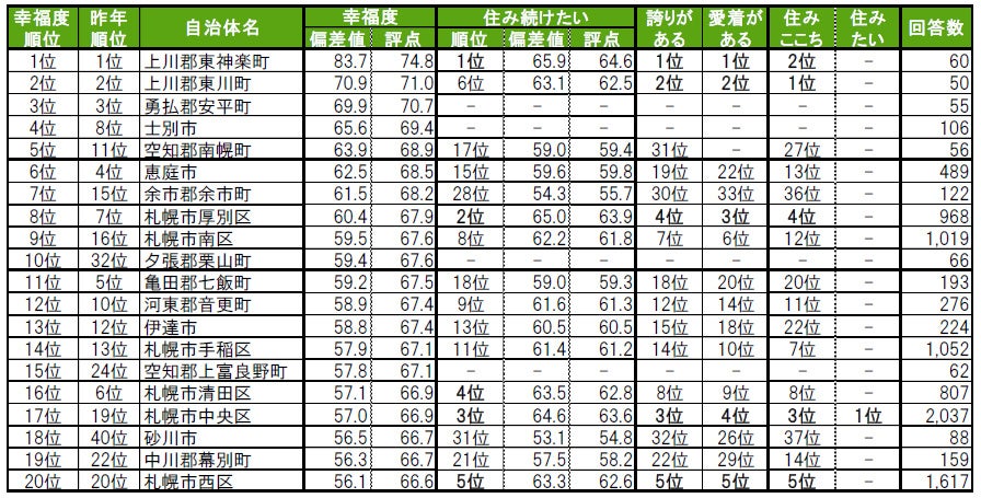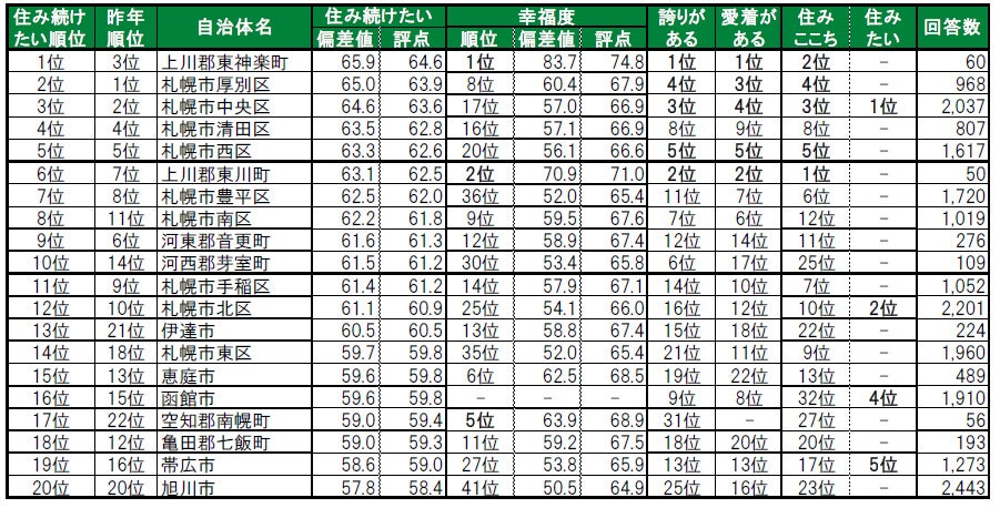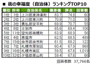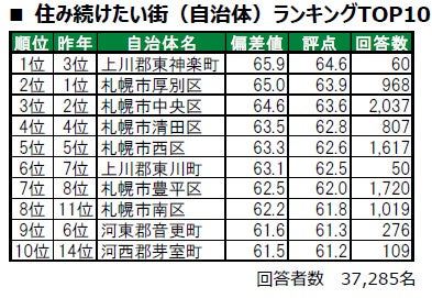 1位は、昨年3位から順位を上げた上川郡東神楽町です。2位は札幌市厚別区、3位は札幌市中央区です。トップ10のうち、6自治体が札幌市の行政区となっています。