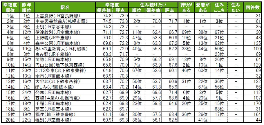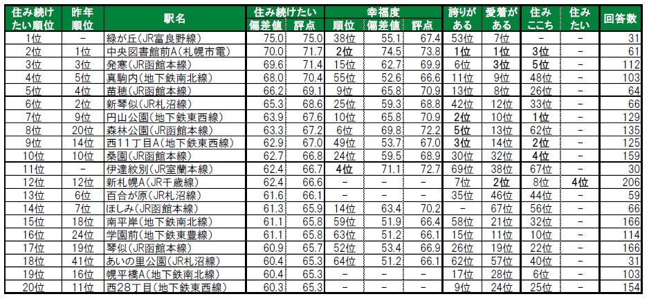※駅ランキング:18位芽室(JR根室本線)は、2021年~2025年の累計回答数が30名未満で、2020年回答を含めても30名に達しなかったため、「住み続けたい」「誇りがある」「愛着がある」の集計対象外となっています。そのため「-」と表記しています。