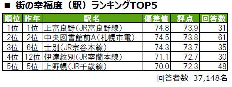 ■街の幸福度(駅)トップは、3年連続で上富良野