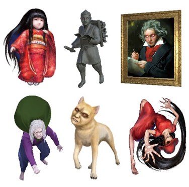 ・口裂け女・ひきこさん・生首ドリブル・四時ババア・渦人形・トイレの花子さん・ターボババア・足売りババア・モナリザの怪・アクロバティックサラサラ・二宮金次郎の怪・人体模型の怪・八尺様・お菊人形・ベートーベンの怪・首なしライダー・くねくね・ブリッジマン・カマキリさん・ババサレ・人面犬・トンカラトン・テケテケ・メリーさん