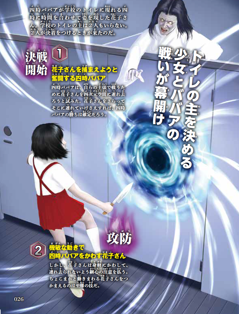 宝島社の「最強バトル図鑑」シリーズから、『都市伝説最恐バトル大図鑑』を5月25日に発売します。本書では、「トイレの花子さん」や「口裂け女」など、生き物として存在がうわさされる国内の都市伝説たちが迫力のバトルを繰り広げ、最も恐い(?)都市伝説を決定します。「口裂け女」vs 「ひきこさん」、「二宮金次郎の怪」 vs 「人体模型の怪」など8属性24体が参加し、それぞれの恐怖力や必殺技などをもって、トーナメント方式で戦います。果たして頂点に立つのは・・・⁉ そのほか、世界の都市伝説と戦うエキシビションマッチや部門別ランキングも掲載し、子どもから大人まで、世代を超えて楽しめる一冊となっています。