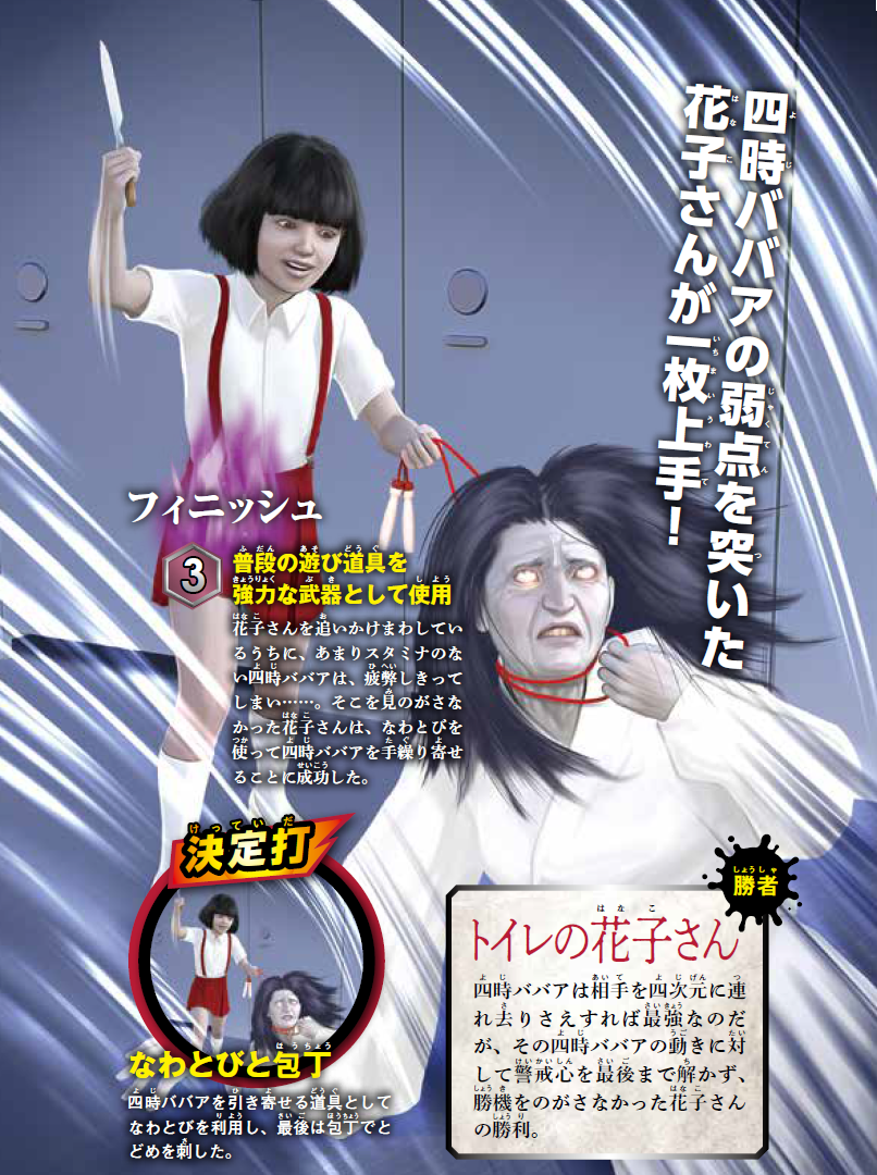 ③疲弊した四時ババアを、花子さんはなわとびを使って引き寄せ、包丁でとどめを刺した!