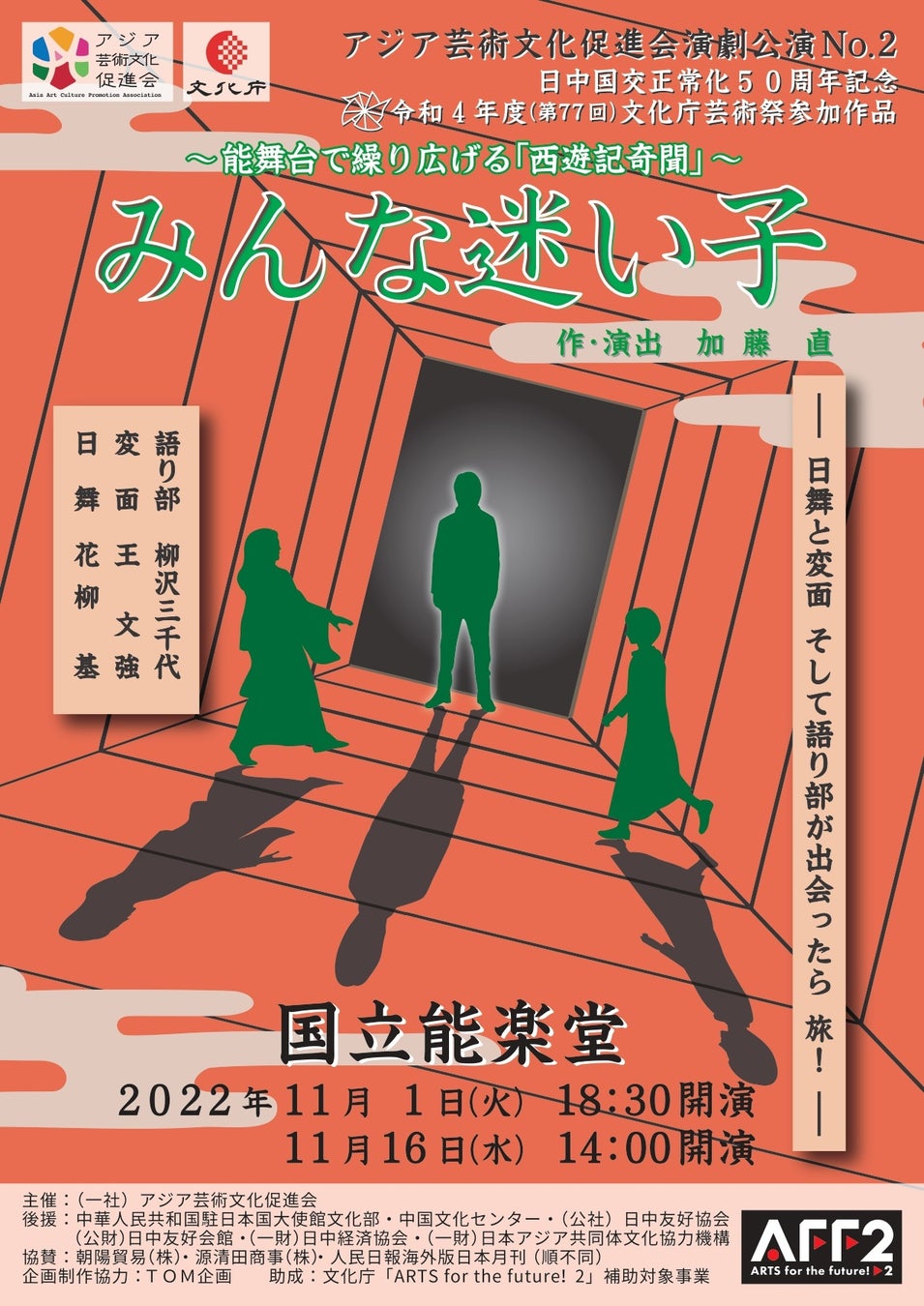 一般社団法人アジア芸術文化促進会(代表:王 文強/プロデューサー:山本 晶、以下「当促進会」)は、今年2022年に日中国交正常化50周年の節目を迎える記念公演として、日本舞踊と変面の日中両国の伝統芸能に、現代的な語りの要素を加えた新しい舞台、【〜能舞台で繰り広げる「西遊記奇聞」〜『みんな迷い子』】を、今秋国立能楽堂で上演します。