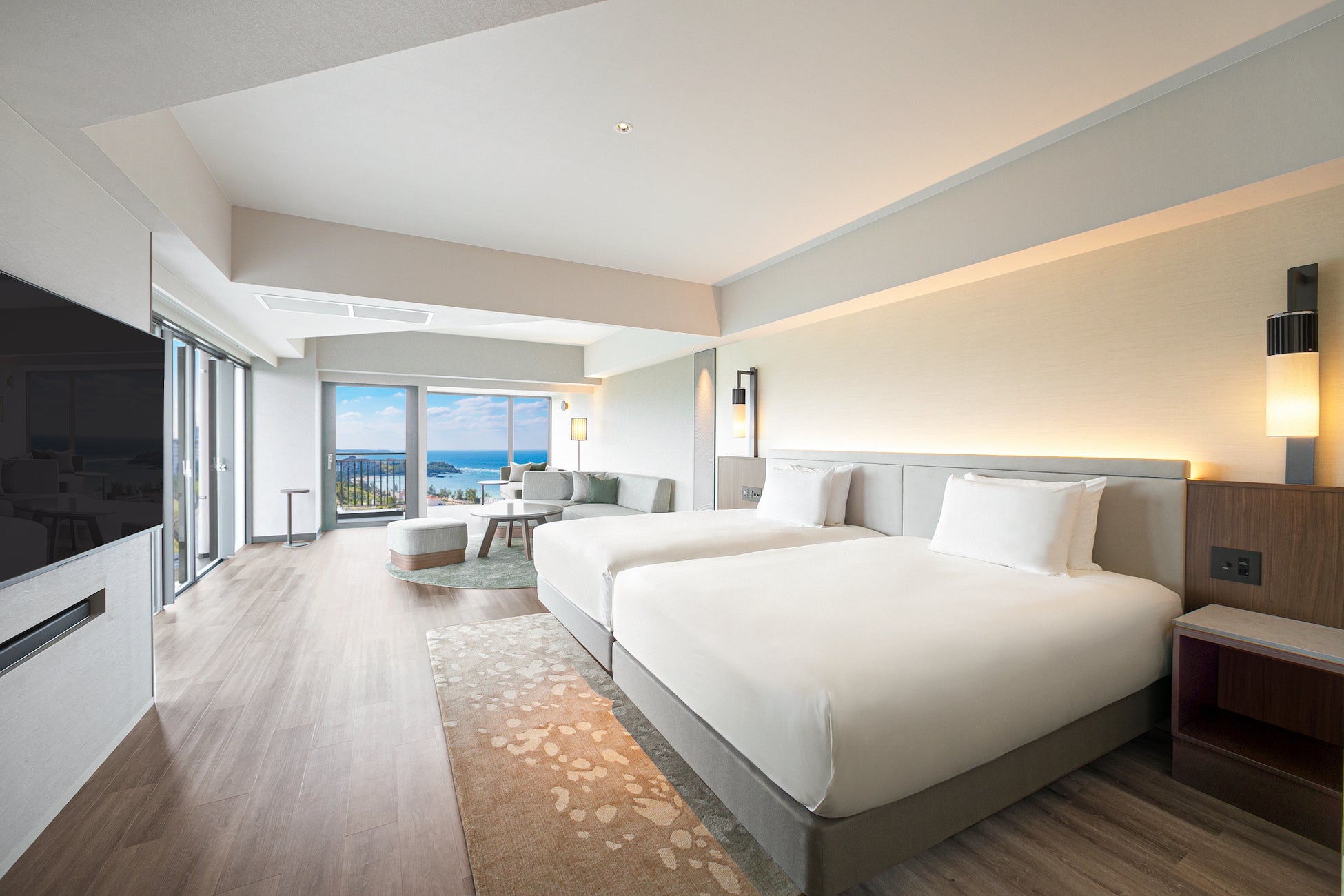 全室オーシャンビューで44 ㎡以上の広々とした客室(361室)が特徴で、2024年春に288室が、やんばるを体験する旅の拠点にさらにふさわしい空間へと生まれ変わります。木漏れ日が降り注ぎ、やんばるの森に自生する植物をふんだんに配置した緑溢れるロビーエリアでは、ホテルのコンセプトである「島とあそぶ 森とつながる」をイメージした環境音楽が流れ、やんばるの夜の森に佇んでいるような没入感と、日常から切り離された開放感が交差する空間を演出しています。