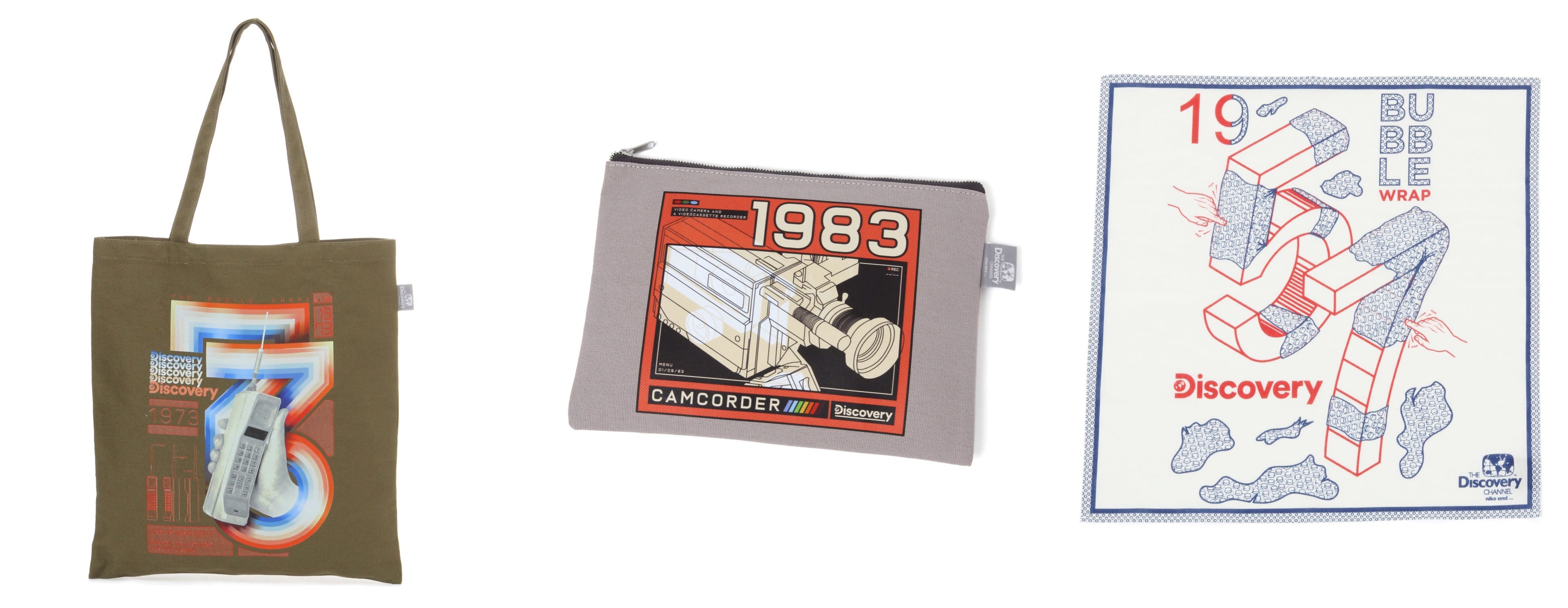 コラボレーションアイテムは、ディスカバリーチャンネルの変遷をコンセプトに、歴代のロゴと発明品の歴史をモチーフにデザインされたアートから、ニコアンドの雑貨やアパレルと相性の良いレトロなデザインを採用し、ニコアンドの人気アイテムに落とし込みました。トートバッグやロンT、クッションなど、このコラボでしか手に入らない特別なアイテムラインアップとなっています。