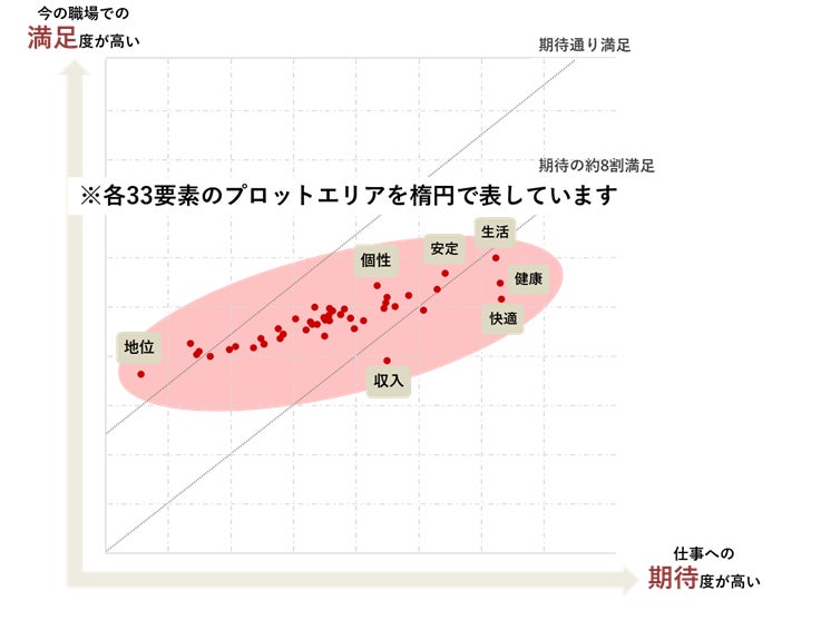 グラフは、働く幸せの33要素を「仕事への期待度」と「今の職場での満足度」でプロットし、そのエリアを楕円で表現しています。各分析結果は、この楕円で示されたプロットエリアと、33要素の平均を表示しています。