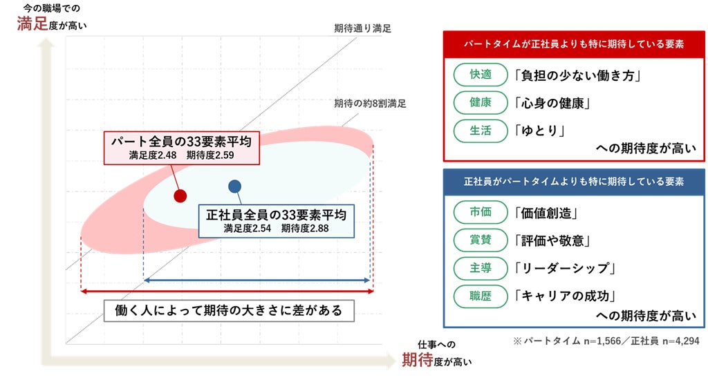 「パートタイム労働者」と「正社員」を比較すると、パートタイム労働者の方が仕事に期待する要素の幅が広いことがわかります。このことから、パートタイム労働者は期待する要素が多様であるため、固定観念に基づいたマネジメントや採用では効果的に機能しづらいことが示唆されます。また、パートタイム労働者は「負担の少ない働き方」「心身の健康」「ゆとり」を重視する一方、正社員は「価値創造」「評価や敬意」「リーダーシップ」「キャリアの成功」を重視する傾向があります。このことからも、パートタイム労働者と正社員を一括りにして同じようなマネジメントを行うことは適切ではないことがわかります。