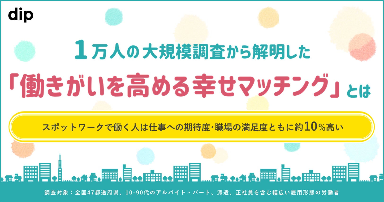 ディップ株式会社(以下「当社」)は、株式会社ビジネスリサーチラボ(以下「ビジネスリサーチラボ」)と共同で、パート・アルバイト、派遣、正社員を含む幅広い雇用形態の労働者1万人におよぶ大規模な「幸せマッチング調査(2024)」(以下「本調査」)を実施いたしました。