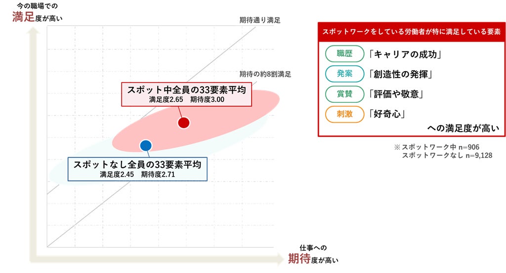 ・スポットワークをしている方はそうでない方に比較し、仕事への期待度が+11%、職場での満足度が8% 高い
