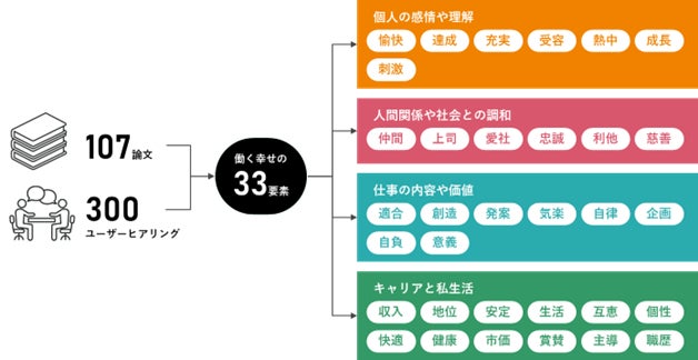 本調査は、働く幸せの本質を解明しようとする画期的な取り組みです。特筆すべきは、国内外107の研究論文を検討し、さらにユーザー300人へのヒアリング結果も考慮することで、働く幸せを33の要素へと分解したアプローチです。