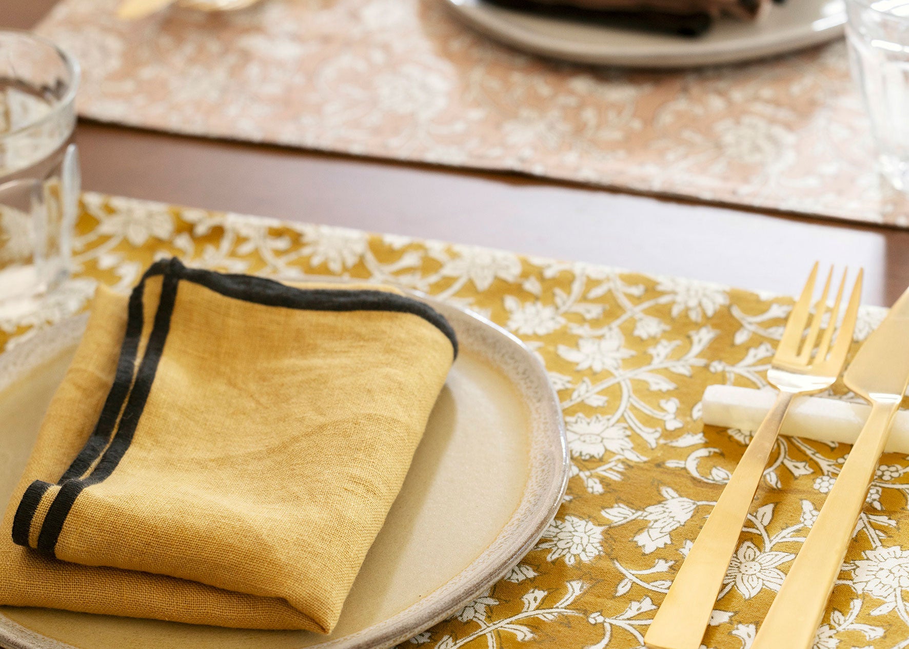 キッチンを彩るエプロン、マルチクロス、プレイスマットに加え、インテリア空間を引き立てるクッションカバーなど、豊富なラインナップが特徴です。