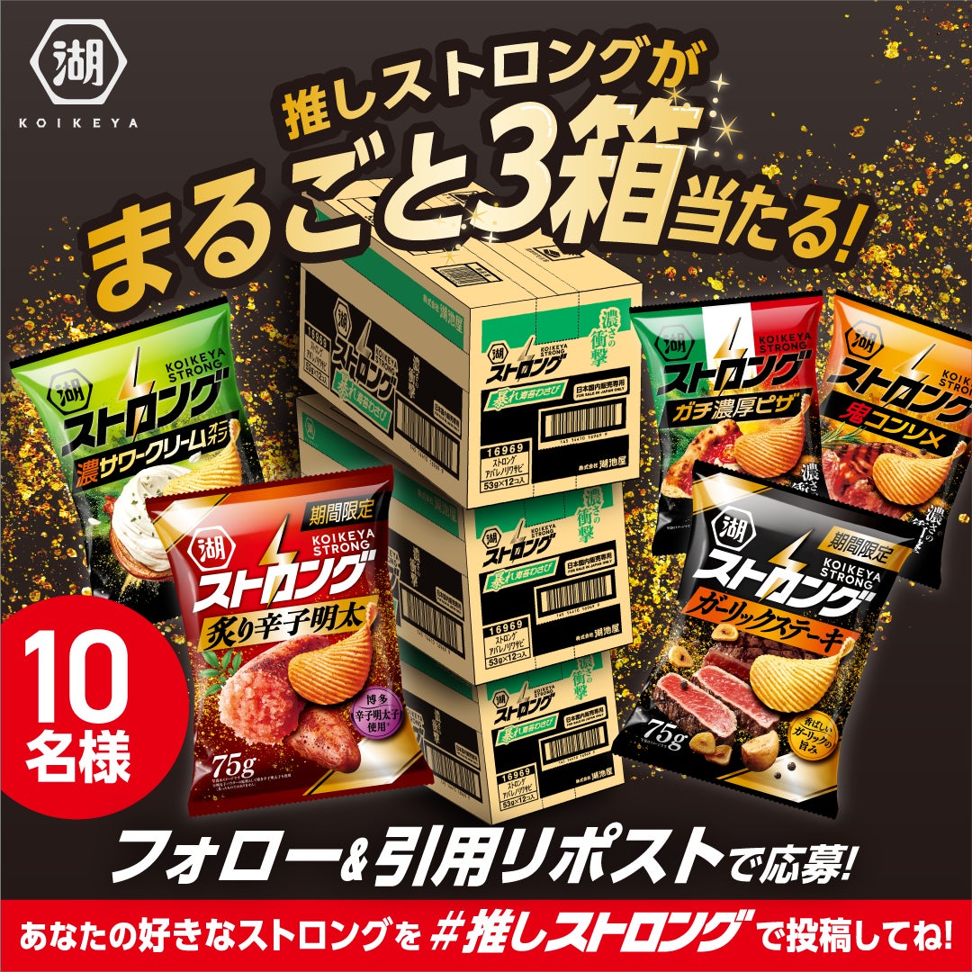 湖池屋 コイケヤ【公式】(@koikeya_cp)をフォローしていただいた上で、キャンペーン投稿に「#推しストロング」と、あなたが好きな「湖池屋ストロング」の商品名をつけて、引用リポストしてください。