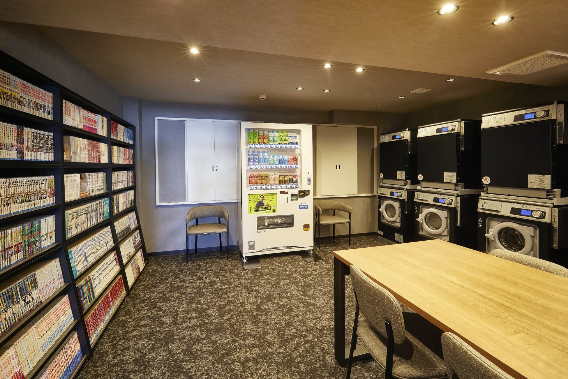 出張・旅行に便利なコインランドリーを館内に完備。洗濯の待ち時間やブレイクタイムに1,500冊の中からお好きな漫画をお楽しみいただけます。自動販売機や簡単なお仕事が出来るワークチェアもご用意しておりますので、お客様に合わせた楽しみ方でお過ごしいただけます。
