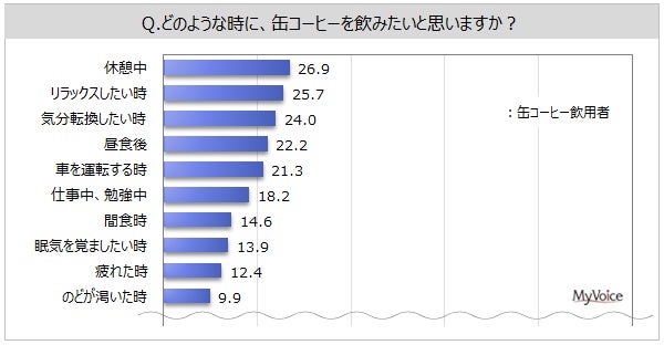 ■缶コーヒー飲用者が飲みたいシーンは「休憩中」「リラックスしたい時」「気分転換したい時」「昼食後」「車を運転する時」が各20%台。男性30~40代では「仕事中、勉強中」が1位