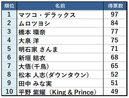 理由:【マツコ・デラックス】面倒がりつつ、どんな話でも付き合ってくれそう(24歳女性/埼玉県)、知識豊富で何を話してもいろいろな意見が聞けて楽しそう(27歳男性/茨城県)