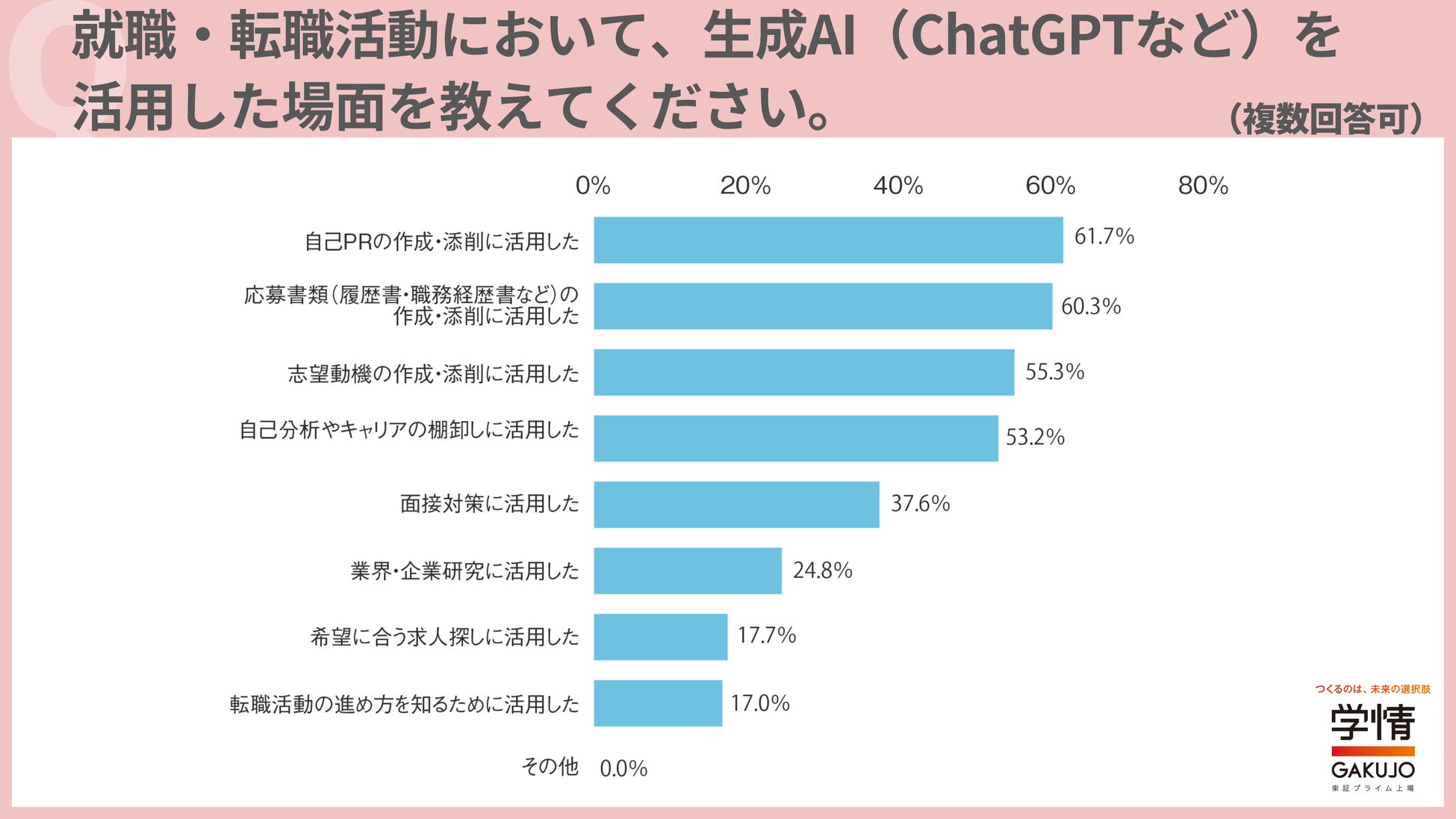 株式会社学情(本社:東京都中央区)は、20代の仕事観や働く意識をひも解くため、20代の転職希望者を対象に生成AIの活用についてインターネットアンケートを実施しました。就職・転職活動で生成AIを利用している人は「よく利用」と「時々利用」を合わせて半数近くに上りました。具体的には「自己PRの作成・添削」「応募書類(履歴書・職務経歴書)などの作成・添削」が6割を超えたほか、「面接対策」「業界・企業研究」など転職活動で必須とされる様々な作業で活用していることが分かりました。一方、転職先の企業で生成AIなどの最新技術を活用できるかどうかは、「重視しない」「あまり重視しない」が合わせて6割に。採用選考での企業側の生成AI利用に関しては「特に印象は変わらない」が過半数を占めました。現状では、企業の生成AI活用姿勢は企業選びにはあまり影響していないという結果となりました。