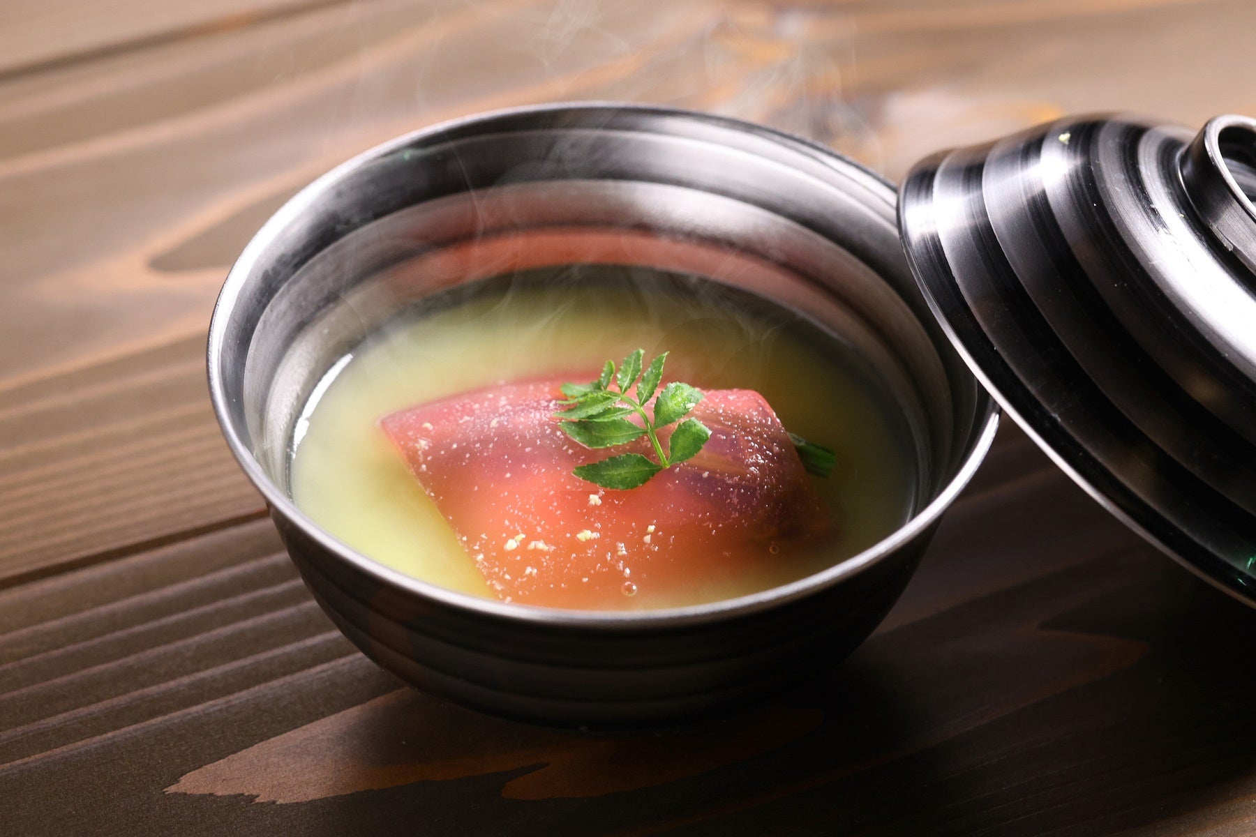 冷製スープはトマトベースに料理長渾身の出汁を合わせ、桜海老がふわっと香り、椿の花びらを浮かべることで見た目も可愛らしく仕上げました。