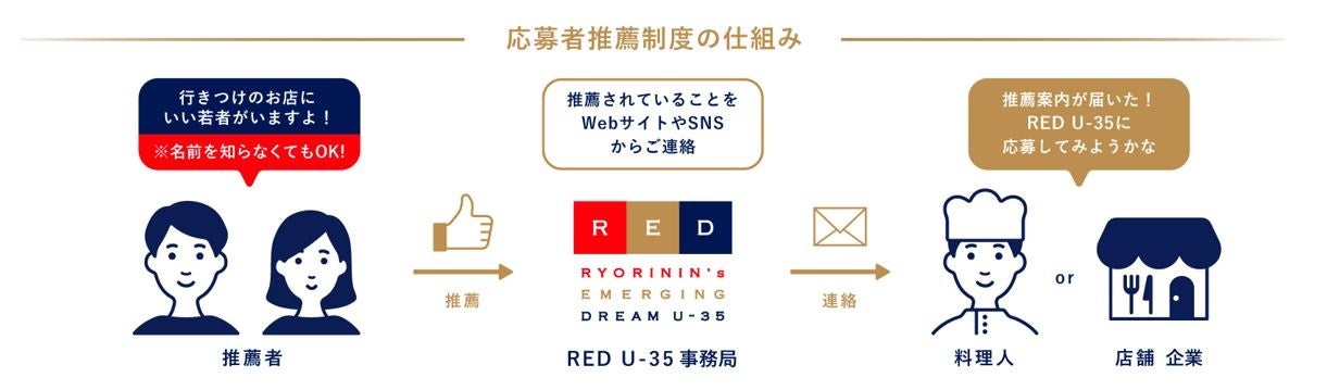 RED U-35では、「応募者推薦制度」を実施しています。この制度は、一般の方から行きつけのお店/近所のお店/お知り合いのお店などで「この料理人はスゴイ!」と思う35歳以下の若手料理人を推薦いただくものです。料理人の名前を知らなくても、「店舗名・地域」などの情報をいただくと事務局より、RED U-35の応募案内をお送りします。