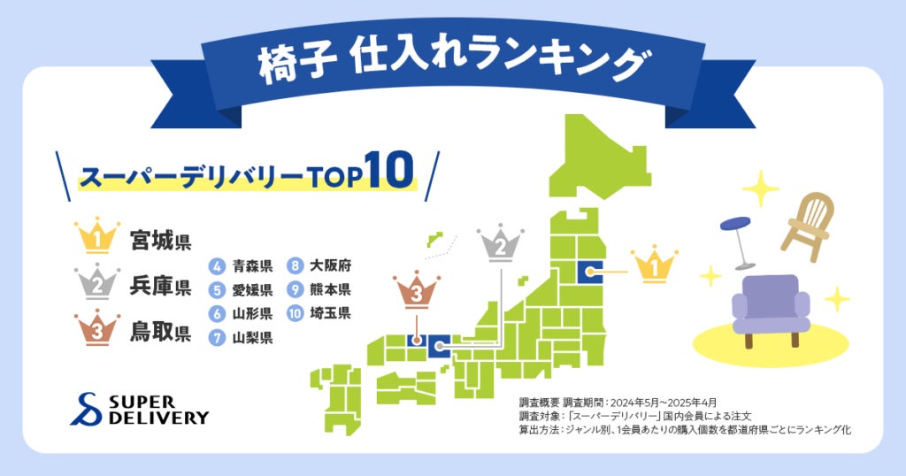 椅子の仕入れランキングでは、宮城県・熊本県・埼玉県など、新設住宅着工比率の高い地域が上位にランクインしました。