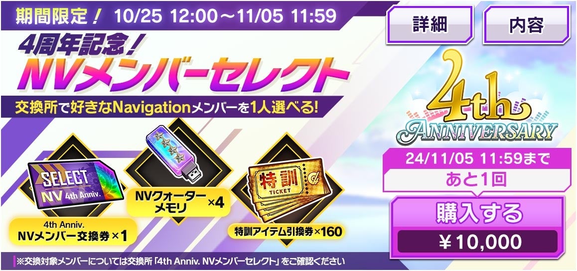 NVメンバー交換券を含むNVメンバーセレクトパックなど、4周年を記念したお得なパックを販売いたします。また、グルミク Web Store限定で★4・SP確定ガチャチケット2025付きダイヤパックも販売いたします。