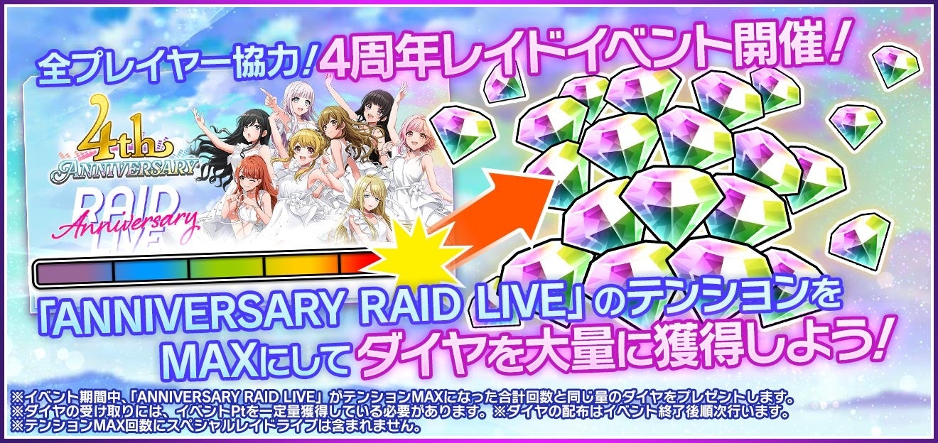 イベント開催期間中、テンションがMAXになった「ANNIVERSARY RAID LIVE」の累計数に応じてダイヤがもらえる全プレイヤー協力型のキャンペーンを実施いたします。イベントポイントの累計達成報酬である「ダイヤ交換券」を獲得したユーザーが対象です。ぜひご参加ください!