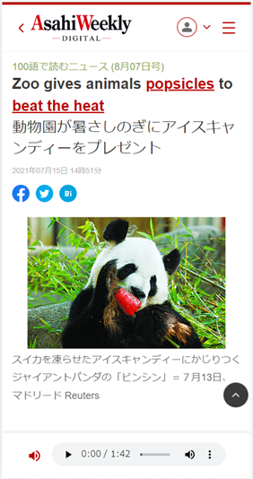 難しい単語や表現のところをマウスオーバーすると、日本語のヒントや解説が現れ、初級の学習者でも気軽に読み進められる工夫も。ネイティブスピーカーが英文を読み上げる音声も、ボタン一つで再生が可能で、「読む」と「聞く」の訓練がワンストップでできる仕組みです。また、毎週のAsahi Weeklyの紙面も、PDFファイルですべて見ることができます。