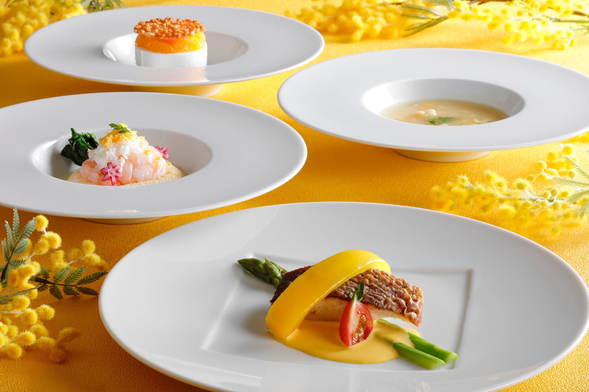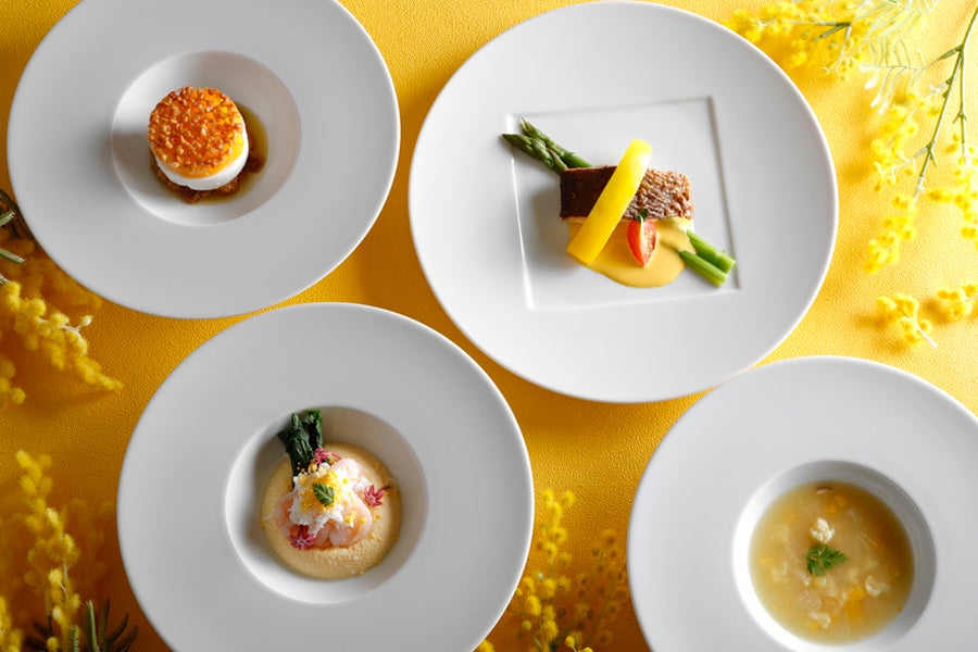 前菜は海老と菜の花をミモザ風に、スープには黄色の野菜を使用するなど