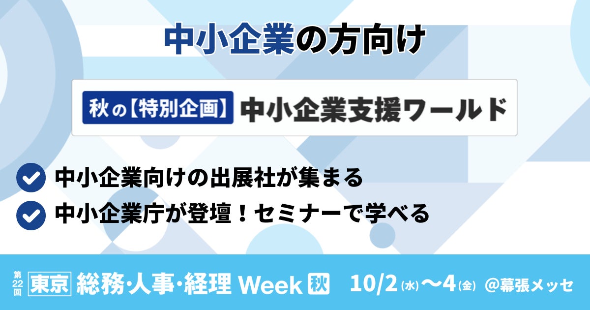 第22回【東京】総務・人事・経理 Week 秋 にて、特別企画 中小企業支援ワールドを開催。会期:2024年10月2日(水)~4日(金) 会場:幕張メッセ