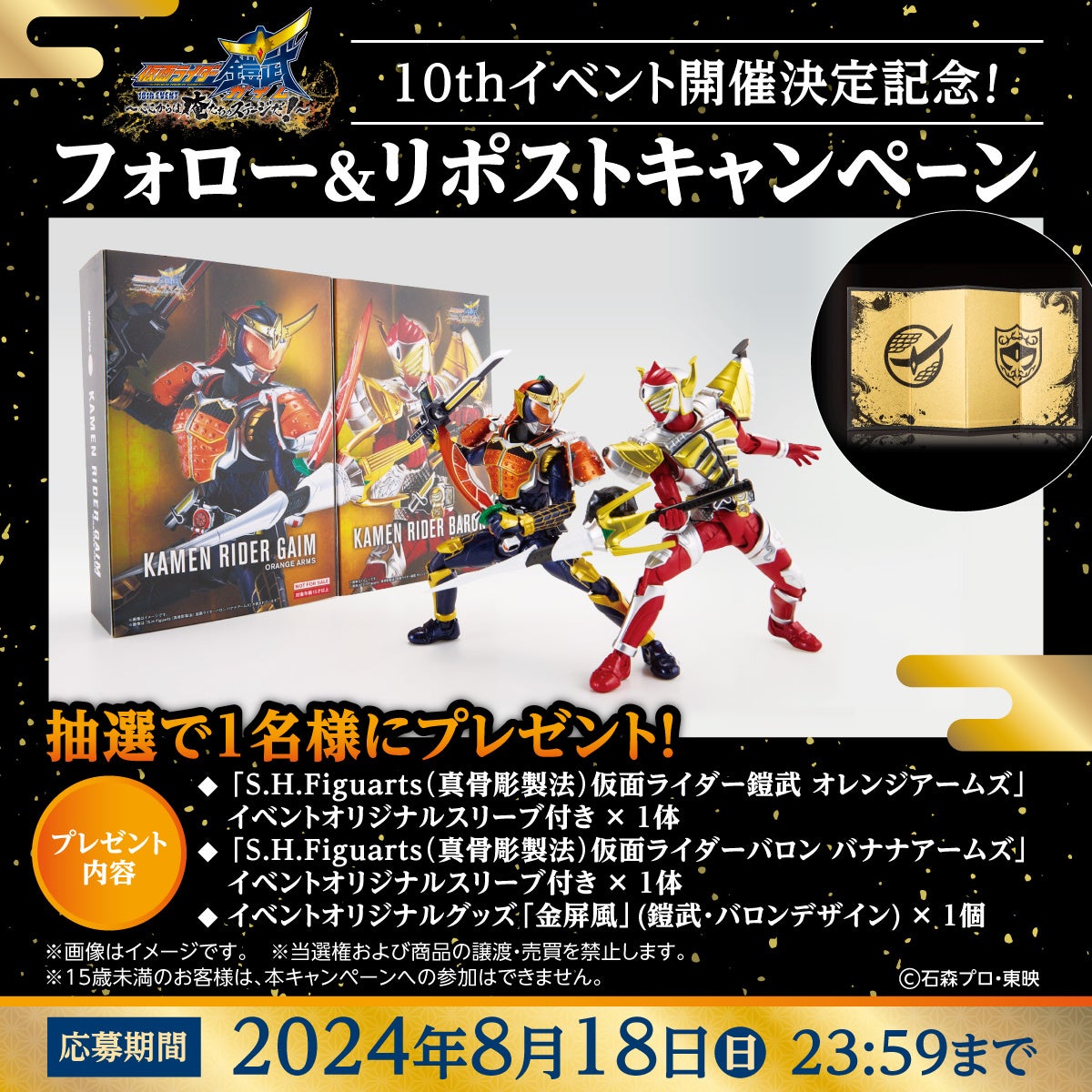 イベント公式X(旧Twitter)アカウント( @bnam_riderevent [ https://x.com/bnam_riderevent ])をフォローし、対象のキャンペーンポストをリポストすると抽選で1名様に、オリジナルスリーブ付きの「S.H.Figuarts(真骨彫製法)仮面ライダー鎧武 オレンジアームズ」「S.H.Figuarts(真骨彫製法)仮面ライダーバロン バナナアームズ」と、オリジナルグッズで販売する「金屏風」のセットが当たります。