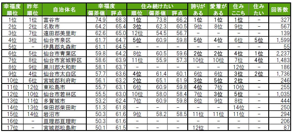 ●1位の富谷市は、「住みここち(自治体)」を含む5つのランキングで1位の高い評価を得ています。●トップ10のうち、7自治体が「住みここち(自治体)」でもトップ10以内に入っている自治体です。●昨年は偏差値50未満で順位を公開しておらず今年トップ17入りしたのは、16位亘理郡亘理町、17位宮城郡松島町です。