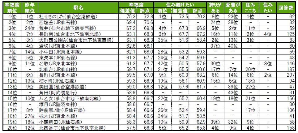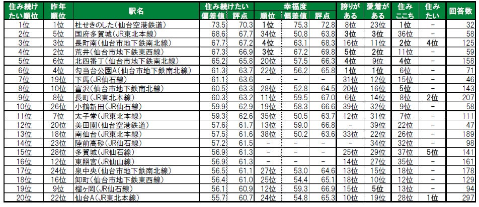 1位は2年連続で名取市に位置する杜せきのしたで、唯一偏差値70台の高い評価を得ています。杜せきのしたは、「住みここち(駅)」でも1位となっている駅です。2位も2年連続で塩竈市に位置する西塩釜です。3位は、仙台市若林区に位置する荒井で、昨年24位から大きく順位を上げてトップ3入りしています。