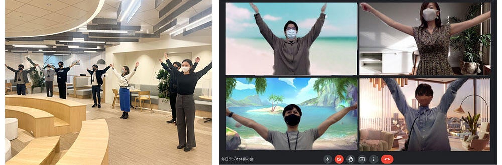 部活動の一つでもあるラジオ体操部と人事部門が連携し、毎日ラジオ体操を実施しています。出社している人だけでなく、在宅勤務者もオンラインで参加しています。