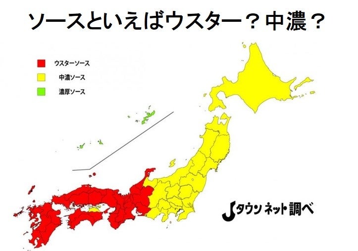 WEBメディア「Jタウンネット」の調査によると、東日本では中濃ソースが主流で、西日本(香川・沖縄以外)ではウスターソースが主流という結果が出ています。境目となるのは⾧野、静岡、富山で、ここ以東は中濃派、ここより西がウスター派となります。