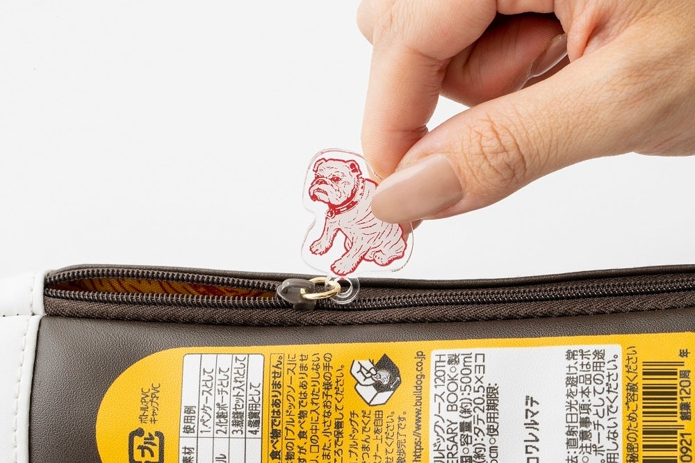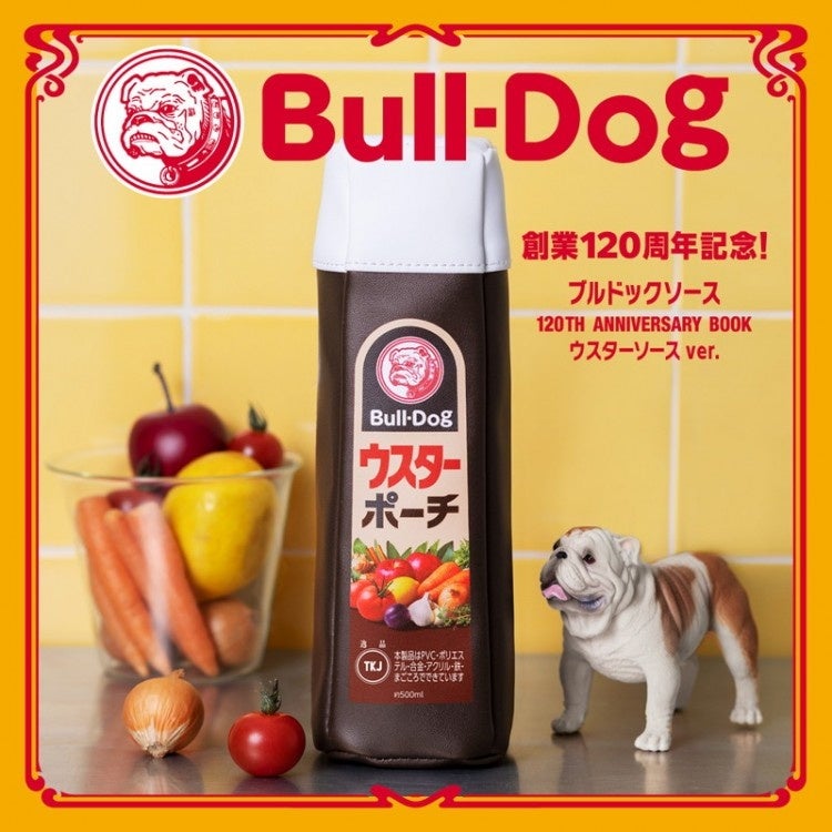 本誌は、「ブルドックソース」の創業120周年を記念した同社初のブランドブックで、本誌限定アイテムにとして「ブルドックソース」そっくりのマルチポーチが付きます。読みごたえたっぷりのパロディラベルと裏地のブルドッグの絵柄は必見です。さらに、本誌発売を記念して、これまで顔部分だけの露出だったコーポレートマークのの“ブルドッグ”の全身の姿を初公開。その愛らしい姿をポーチのチャームにしました。