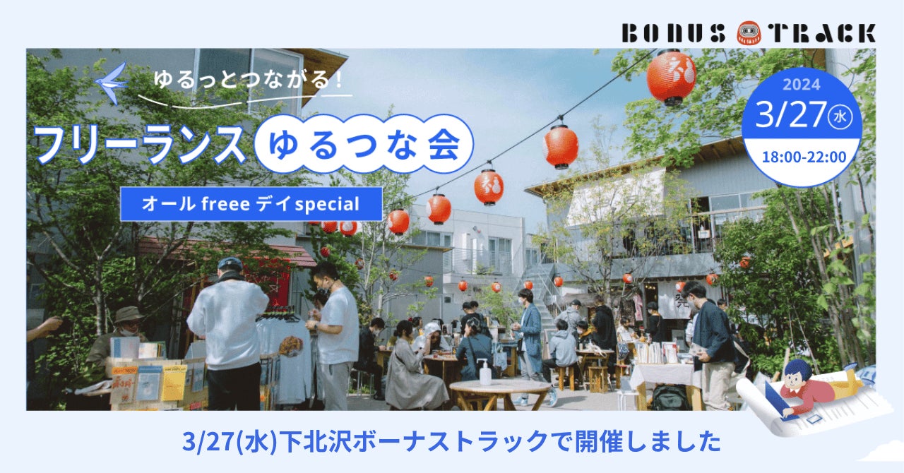 フリー株式会社(本社:東京都品川区、CEO:佐々木大輔、以下「freee」)は、3月27日(水)に、個人事業主やフリーランスが互いに1年間の事業や確定申告の労をねぎらい、新年度に向けて新たな仲間や価値観とつながるイベント「フリーランスゆるつな会〜オールfreeeデイspecial〜」を下北沢のイベント会場「BONUS TRACK」にて開催しました。当日は、フリーランスを中心に約400名が集まり、大盛況となりました。