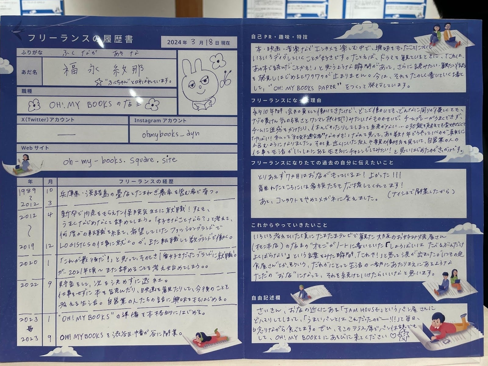 履歴書を書いていただいた一人福永紋那さんは、「雑誌などのインタビューでは、プロフィールなどが綺麗にまとまって掲載されることもあるけれど、この履歴書は自分に正直に向き合って恰好悪いところも書いた。」と語ってくださいました。福永さんのおっしゃる通り、正直な言葉で書かれた履歴書の一つひとつが訪れた人の興味を引いていました。