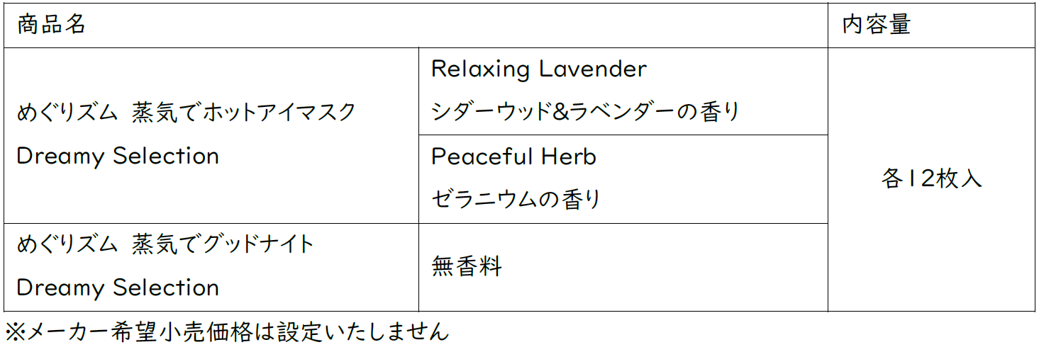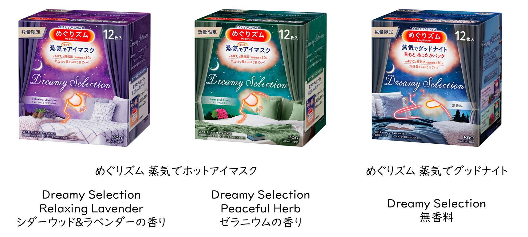 季節も変わり、日に日に夜が長くなるこの時期。「めぐりズム」より、そんな夜におすすめの「めぐりズム Dreamy Selection」シリーズ3品をご用意しました。「蒸気でホットアイマスク」は、ラベンダーとウッディーなアロマを使った上質で落ち着きのある香り「Relaxing Lavender シダーウッド&ラベンダーの香り」と、ゼラニウムとハーブを使った軽やかで心地よい香り「Peaceful Herb ゼラニウムの香り」の2種を揃えました。また、首もとに貼るシート「蒸気でグッドナイト」は、「蒸気でホットアイマスク」と一緒に使用する際に香りをお楽しみいただけるよう、無香料タイプ1品をご用意しました。