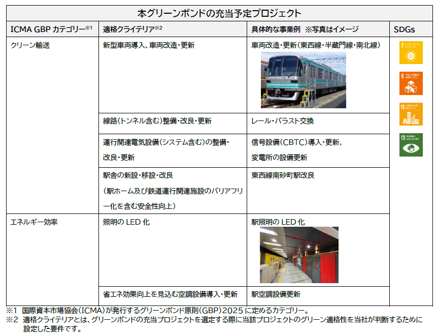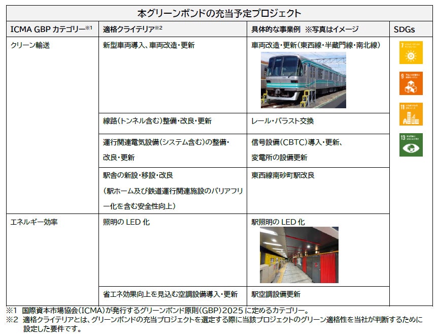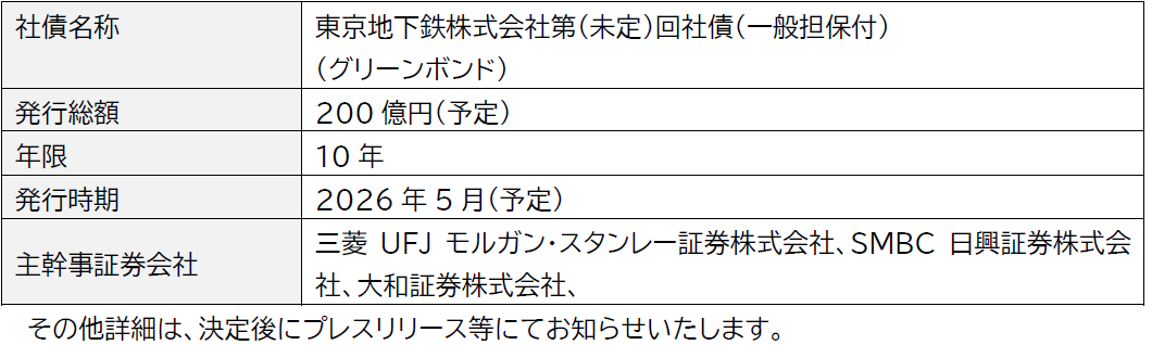 東京地下鉄株式会社(本社:東京都台東区、代表取締役社長:小坂 彰洋、以下「東京メトロ」)は、グループ全体で気候変動の緩和や資源循環に向けた取組みを一層推進するために、2024年3月、2025年5月に続き3回目となる「グリーンボンド」を2026年5月に発行する予定です。