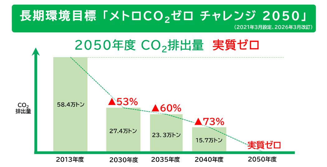 当社グループでは、長期環境目標「メトロCO₂ゼロチャレンジ 2050」において、「2050年度実質ゼロ」の目標を設定しています。2025年度においては、国が新たに定めた次期削減目標(NDC)に基づき、2013年度比で2035年度(▲60%)、2040年度(▲73%)の目標を新たに設定しました。当社グループのCO₂排出量は、ほとんどが電力由来です。長期環境目標達成に向け、電力由来のCO₂排出量は、これまで続けてきた省エネを更に推進するとともに再生可能エネルギーへ大規模な転換を進めることで削減していきます。また、電力以外のその他燃料からのCO₂排出量は、クレジット等の活用でオフセットする方針です。