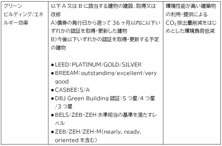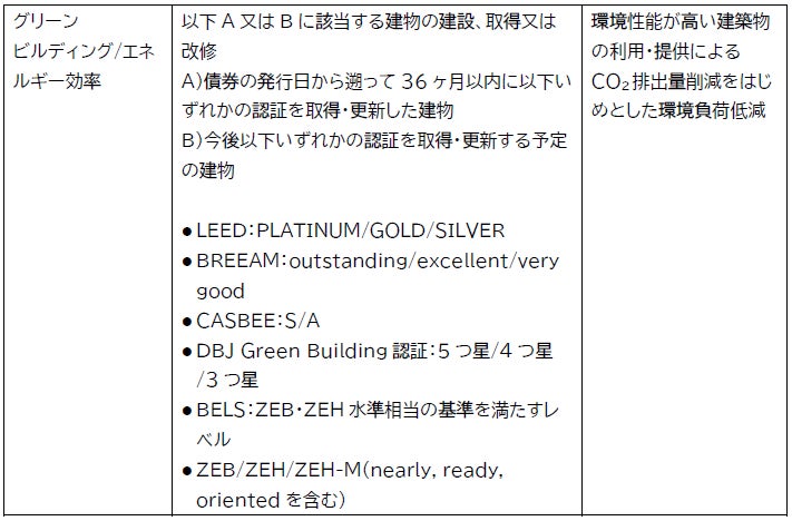 本フレームワークは、国際資本市場協会(ICMA)の定めるグリーンボンド原則(GBP)2025、環境省の定めるグリーンボンドガイドライン2024 年版に基づき策定しております。フレームワークで設定したグリーンプロジェクトの適格クライテリアは以下のとおりです。