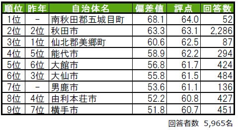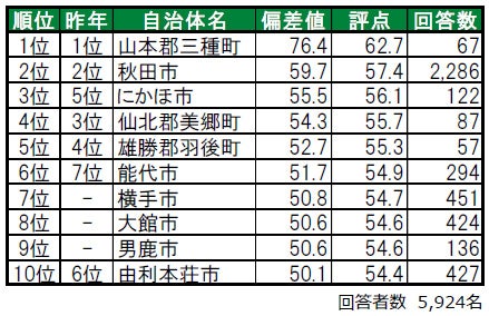 1位は初登場の南秋田郡五城目町で、昨年は累計回答者数が50名未満でランキングの集計対象外でした。2位は4年連続で秋田市で、「住みここち」では1位の高い評価を得ています。3位は仙北郡美郷町で、トップ3の内2つが郡部に属する「町」という結果になっています。その他、昨年は偏差値50未満のため順位非公開だった男鹿市が、今年は7位にランクインしています。