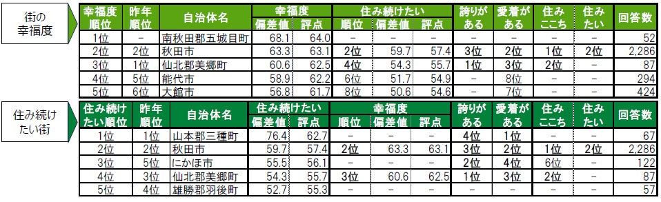 ※幸福度自治体ランキング:1位南秋田郡五城目町は、 2021年~2025年の累計回答数が50名未満で、2020年回答を含めても50名に達しなかったため、「住み続けたい」「誇りがある」「愛着がある」の集計対象外となっています。そのため「-」と表記しています。
