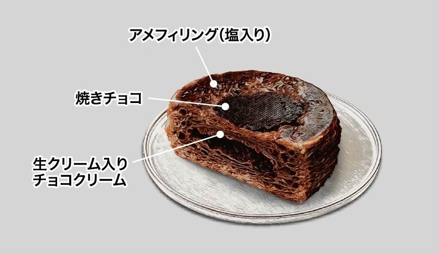 【内容】チョコクリームを絞ったチョコ味のクロワッサン生地に塩味のきいたアメフィリングを絞り、生クリーム入りのチョコクリームを包み込んで焼き上げました。アメフィリングの食感も楽しめるクイニーアマン仕立ての商品です。