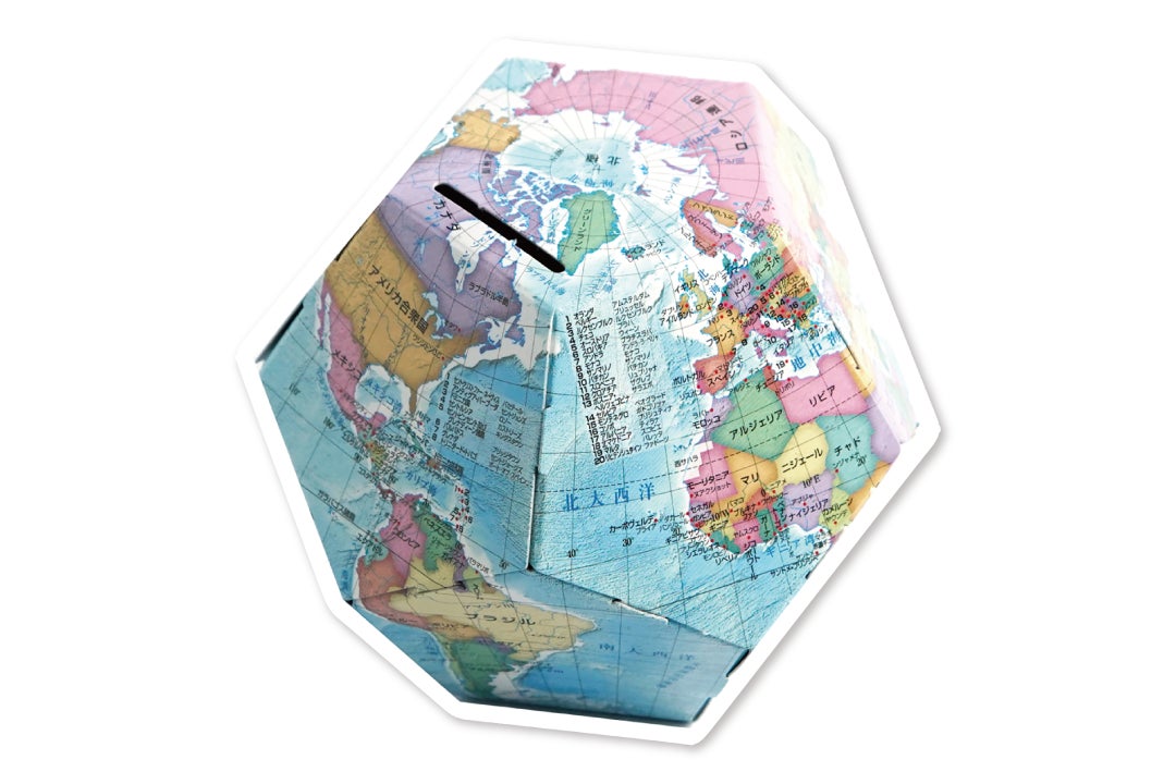 のりやはさみなど、道具を使わずに組み立てられる、正十二面体の地球儀。一つひとつの国名・首都名が記載されているので、見るだけで世界の国々にどんどんくわしくなれます! 貯金箱としてもご利用いただけます。