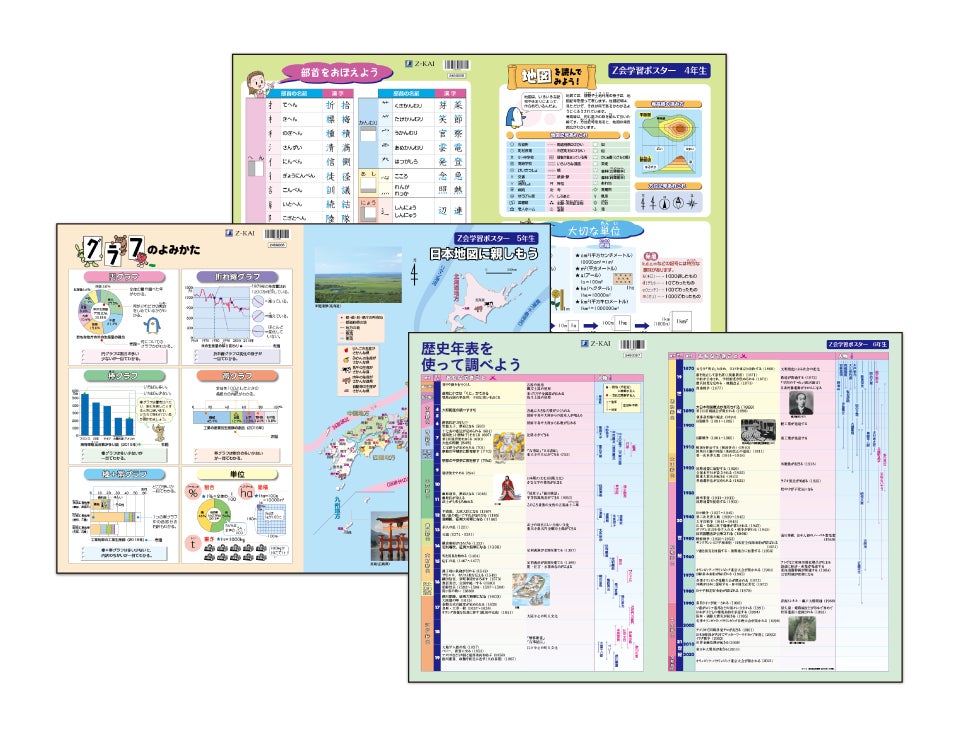 各学年の学習に必要なさまざまな重要知識をまとめた、Z会オリジナルの「学習ポスター」。新4年生なら漢字の「へん」と「つくり」、新5年生なら都道府県と都道府県庁所在地を記した日本地図、新6年生なら縄文時代から21世紀の現代まで網羅した歴史年表など、知っておきたい、覚えておきたい知識を一覧できます。